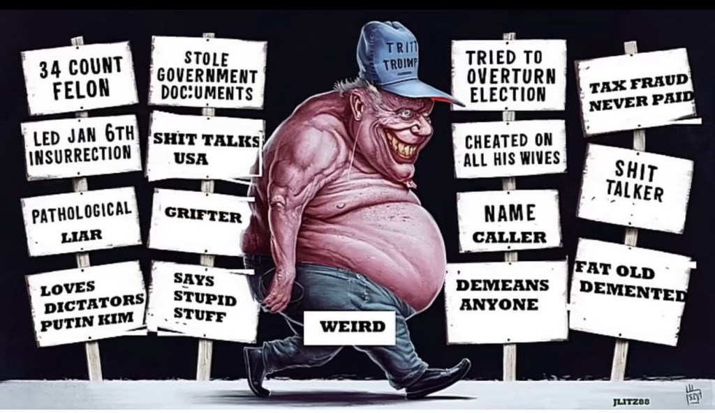 All the berating, name calling and just slanderous talk should sicken the average person, or at least rethink their opinion of the person making all the remarks. Then the question is who is propping him up in all this? Well, all the people buying his trash, the $60 bibles with his name on them, tennis shoes, coins and $100,000 watches. Then there are the very rich that are hoping they will get richer by him being in office.