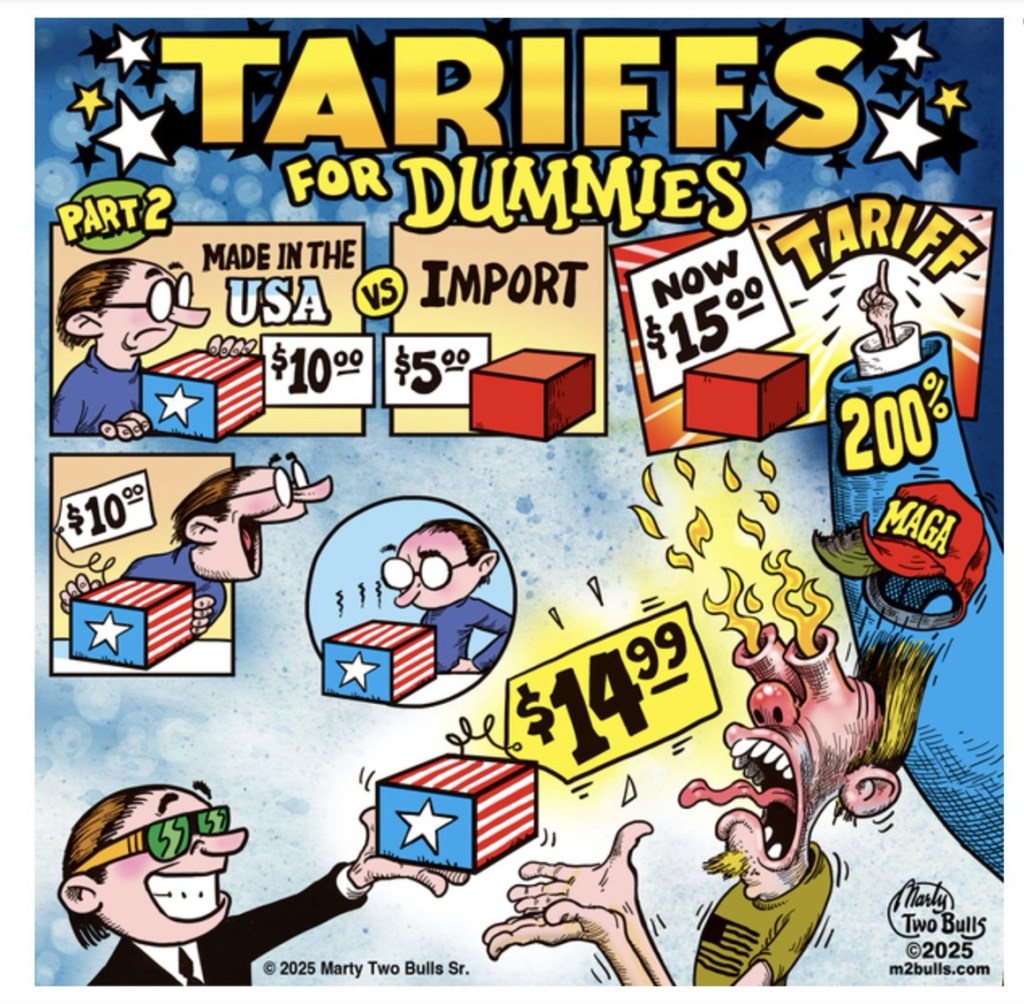 The tariff situation is reminiscent to an international hostage crisis expect Donny has no reasonable demands. Those that don’t understand that our consumer based economy is dependent on foreign made goods and in order for those products to be available retailers in the UNITED STATES will have to buy those products. So let me put this simply, the retailer pays the tariff not the country exporting the goods and that retailers, i.e. Walmart, Target, most grocery chains, automakers, will in turn pass that increase on to consumers, you… you are eventually paying that tariff .