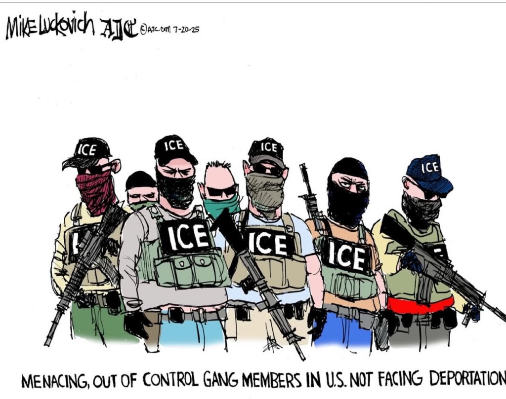 And Trump? Oh, he eats it up. For a man who nearly collapses when an escalator turns into stairs, ICE is the perfect extension of his mythology. They are his muscle, his black-clad avatars of “strength.” Never mind that their “strength” is deployed against terrified families who pose less threat than a malfunctioning handrail. Never mind that when real violence intrudes, ICE is nowhere near the line of fire. In Trump’s telling, they are warriors besieged, noble gladiators defending the republic from the invasion of—checks notes—mothers nursing babies.