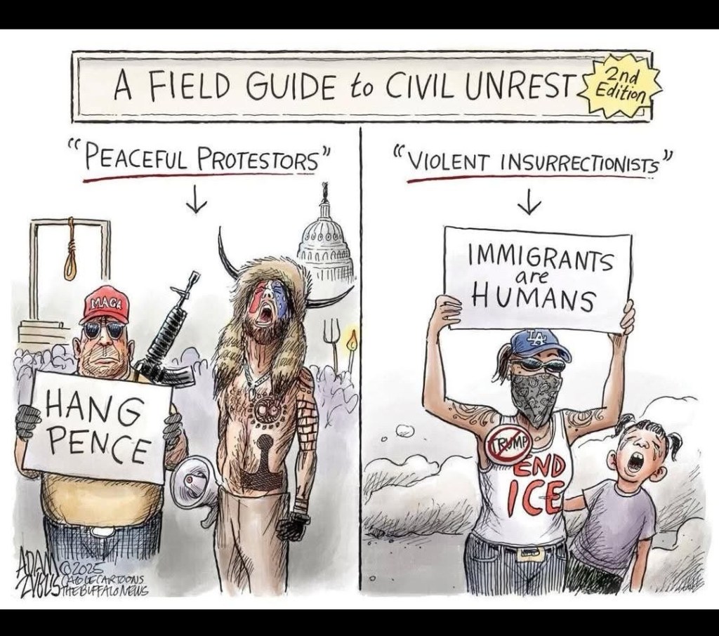 What’s most grotesque is how eagerly the cult laps it up. They cheer the images of ICE agents dragging children away at dawn, but then demand sympathy and tax dollars when their “heroes” cry danger after not even being scratched in an actual shooting. These are the “tough guys” America is supposed to admire: soldiers in an imaginary war, cosplaying courage while avoiding any real risk. They puff out their chests, pose for campaign ads, and remind us of their bravery—all while their Dear Leader trembles at the sight of a staircase.