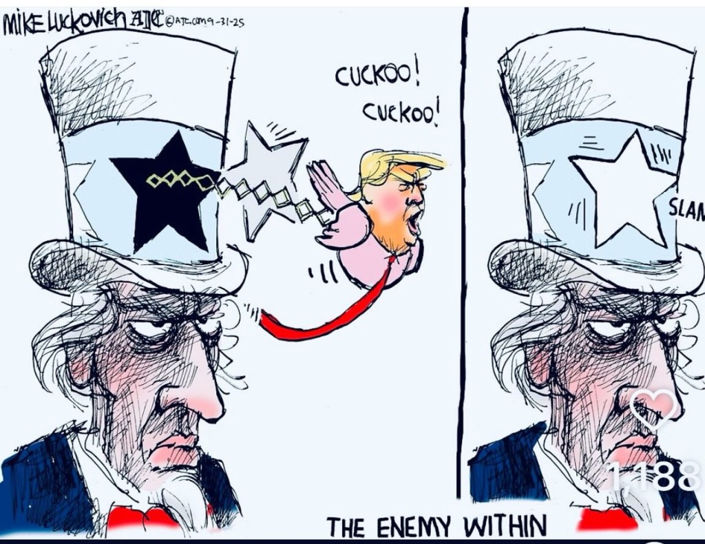 He loves to talk about “enemies within” — the media, Democrats, protesters, librarians, anyone with a functioning moral compass — but let’s be honest: the real enemy within is him and his cult of sycophantic stooges.