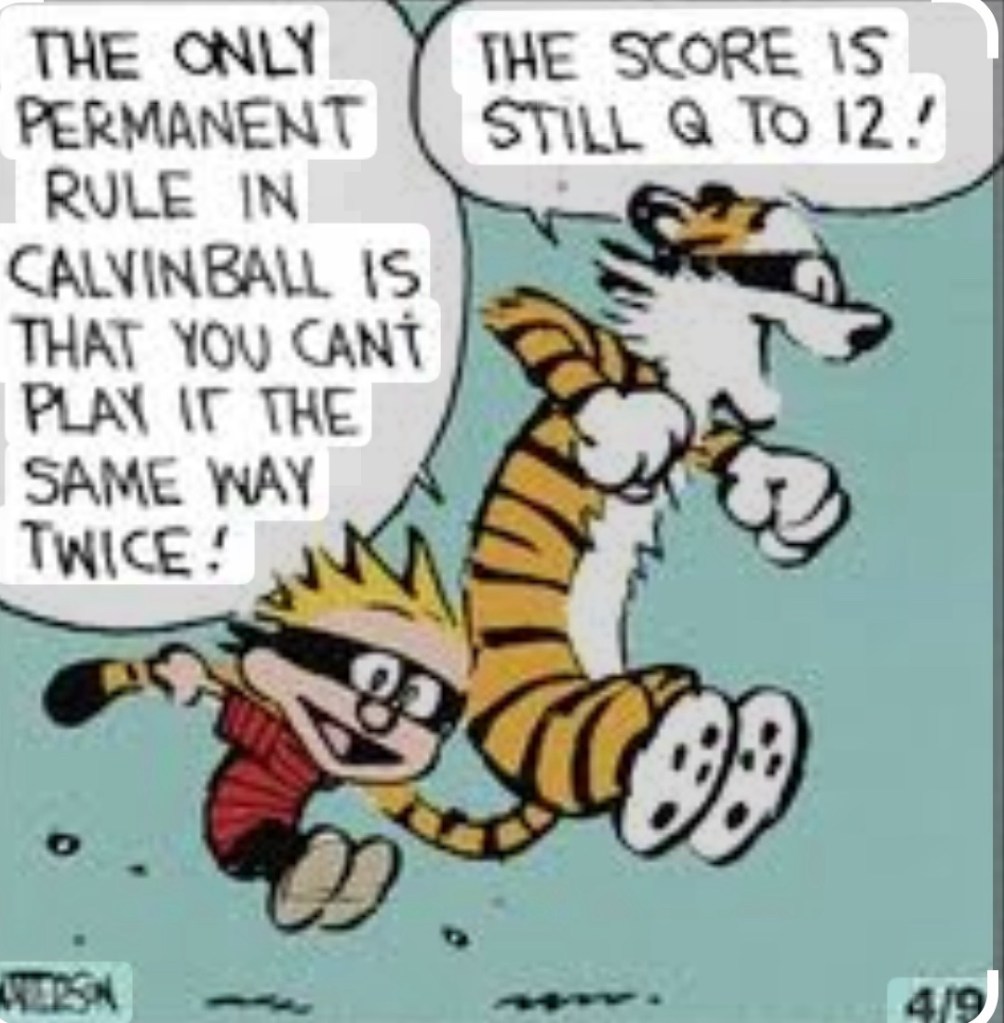 If you grew up with Calvin and Hobbes — Bill Watterson’s legendary comic strip about a precocious six-year-old and his sardonic stuffed tiger — you know that Calvinball is not so much a game as it is a declaration of anarchy wrapped in athletic tape. The official rules of Calvinball are simple: you make them up as you go along, and whatever you say is the rule is the rule — until it isn’t anymore.