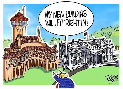 And so, the White House, that iconic seat of democracy, is to be reborn — not as a symbol of the people, but as a monument to one man’s delusion of royalty. The People’s House no longer; soon it will gleam like a casino off the Vegas strip, complete with embossed T’s on every surface and a marble bust of Donald himself, probably winking.