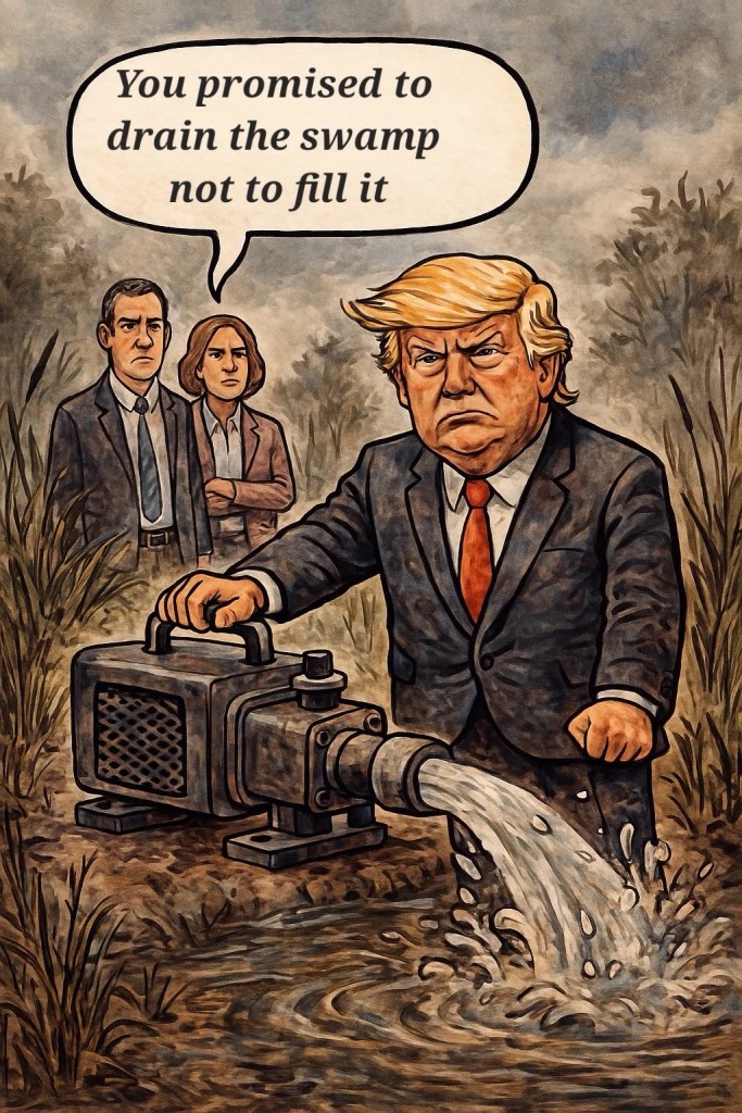 The swamp isn’t just deeper now—it’s thriving. It’s an ecosystem. A habitat. A protected wildlife refuge for grifters, sycophants, and anyone willing to nod along while Trump insists he’s the world’s greatest environmentalist, because look—just LOOK—at how green the swamp is getting.