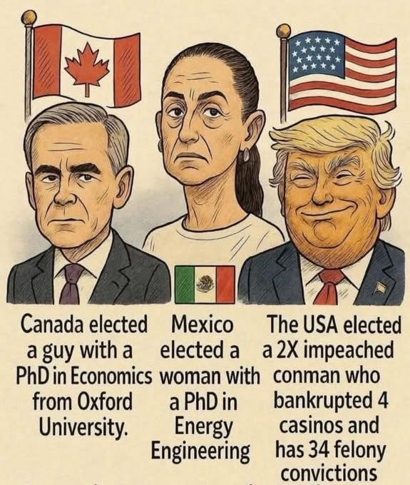 To the south, Mexico—long caricatured by American politicians who couldn’t find Oaxaca on a map—went ahead and elected a trained scientist, an administrator, a person who appears to believe in data, institutions, and the radical idea that government might actually do things. To the north, Canada continues its long tradition of electing prime ministers who at least pretend to read briefing books, speak in full sentences, and acknowledge that other countries exist without immediately threatening them with tariffs, walls, or caps-lock tweets.