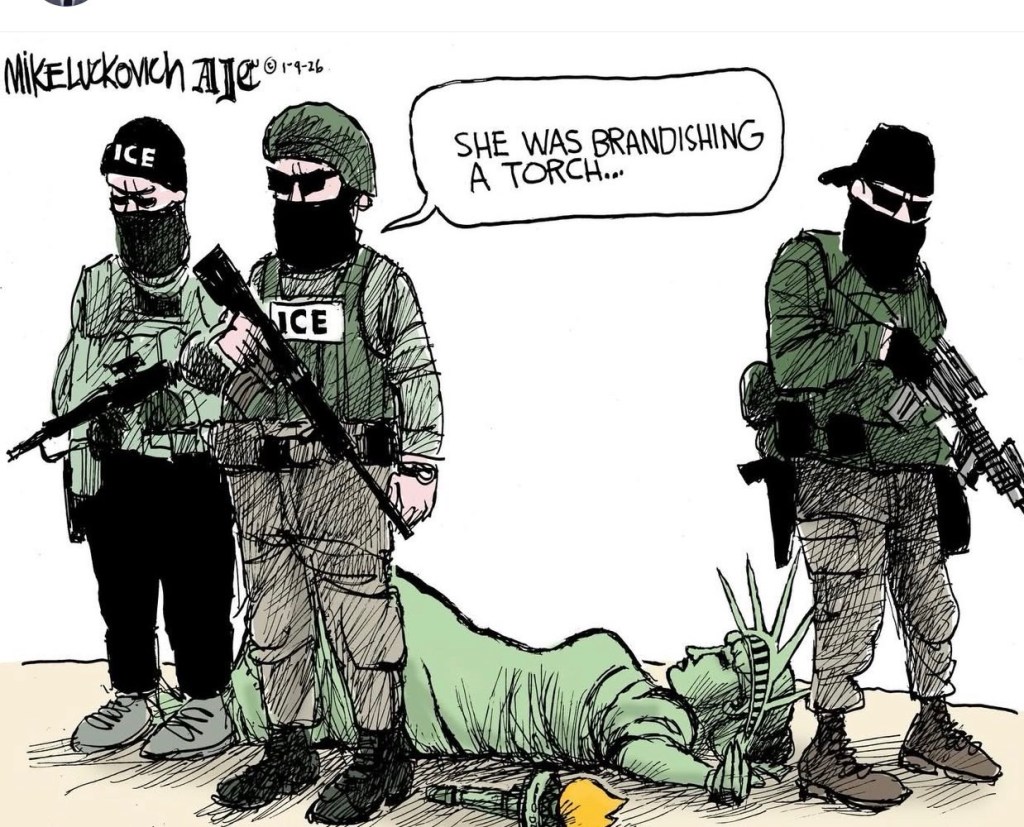 According to the official bedtime story, Trump and his garden-gnome honor guard at ICE haven’t even been at this whole “aggressive enforcement” thing for a full year. Barely a season, really. The paint is still drying on the policies. The jackboots are practically new. And yet—miraculously, tragically, inevitably—we’ve already arrived at the point where a U.S. citizen is shot and killed in Minnesota, and the explanation arrives pre-packaged, shrink-wrapped, and labeled “defensive.”